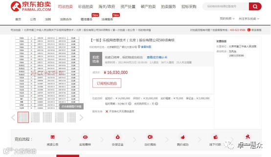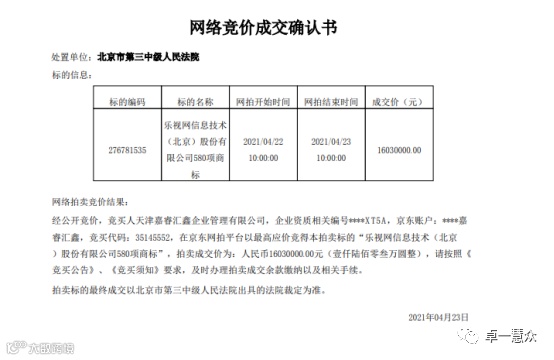 2021年4月,乐视网有一批商标被公开司法拍卖。其中,拍卖标题包括“乐迷”“乐映”“乐生活”“超级朋友圈”等580项商标,起拍价为1400万元,最终以1603万元成交价成功拍出。