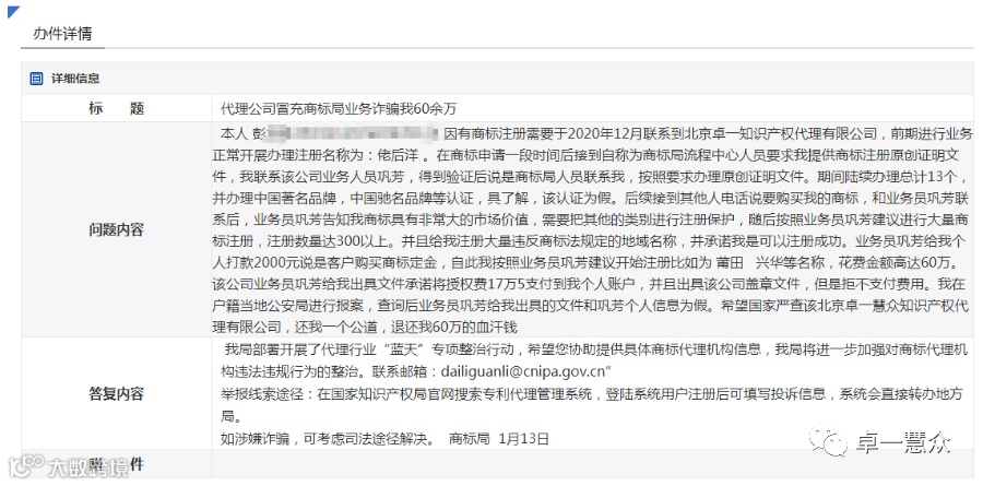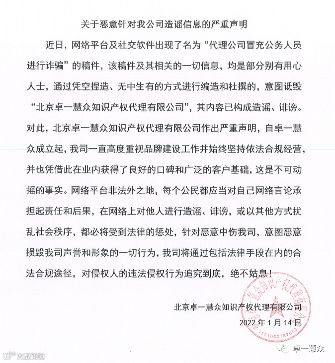 对此,北京卓一慧众知识产权代理有限公司作出严重声明,自卓一慧众成立起,我司一直高度重视品牌建设工作并始终坚持依法合规经营,并也凭借此在业内获得了良好的口碑和广泛的客户基础,这是不可动摇的事实。网络平台非法外之地,每个公民都应当对自己网络言论承担起责任和后果,在网络上对他人进行造谣、诽谤,或以其他方式扰乱社会秩序,都必将受到法律的惩处,针对恶意中伤我司,意图恶意损毁我司声誉和形象的一切行为,我司将通过包括法律手段在内的合法合规途径,对侵权人的违法侵权行为追究到底,绝不姑息!