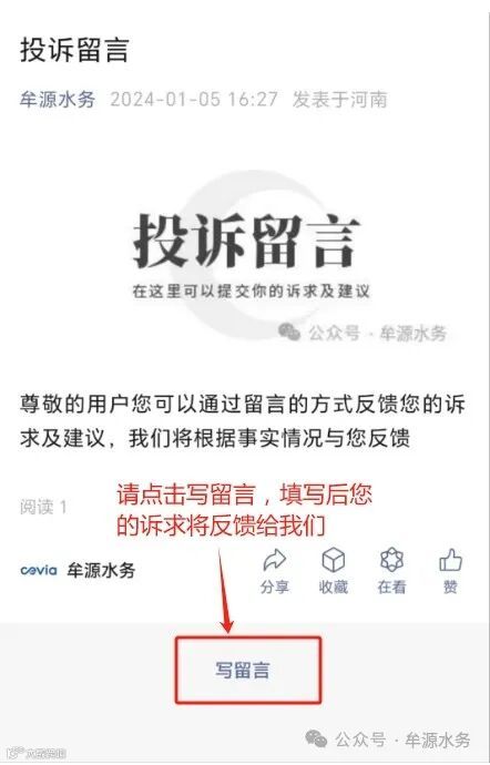 尊敬的用户,如果您再日常生活中遇到用水问题,可以通过写留言的方式向我公司反馈您的诉求及建议,如果需要我们对反馈的问题进行处理回复,请您留下您的手机或者电话号码方便我们与您取得联系。具体留言填写请点击下方“写留言”进行提交。