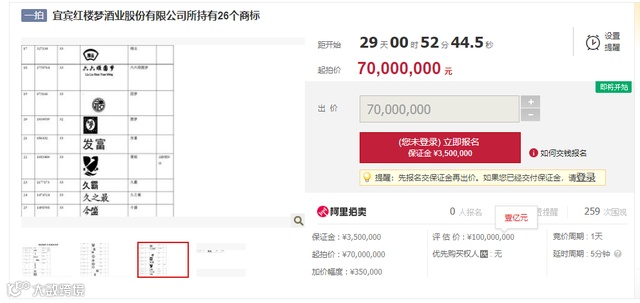 记者获悉, 此次拍卖标的物包括“红楼梦”、“红楼梦长生酒”、“红楼梦金钗”、“红楼梦酒”、“元妃”、“惜春”、“巧姐”、“黛玉”、“宝钗”、“王熙凤”在内的26个商标,双方当事人议价10000万元,起拍价7000万元,较议价打7折,折合每个商标269.2万元。保证金350万元,加价幅度35万元。