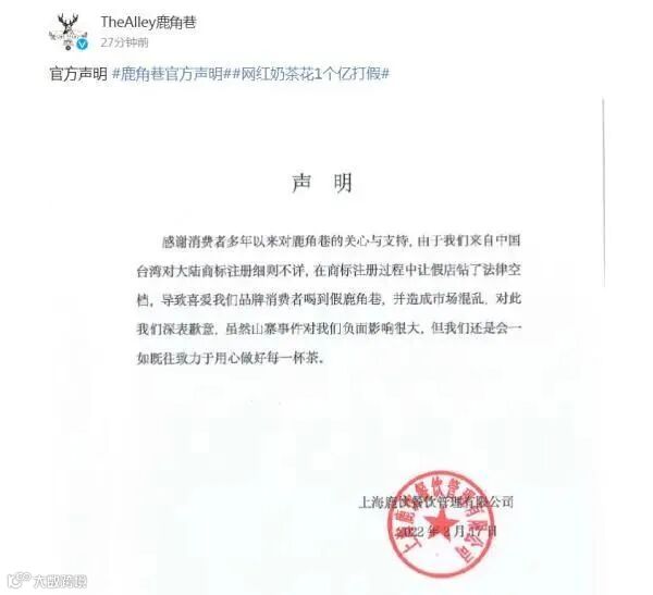 2月17日,报道中提到的奶茶品牌“鹿角巷”在其官方微博发布声明,表示“对商标注册细则不详,让假店钻了法律空档”,对此深表歉意!