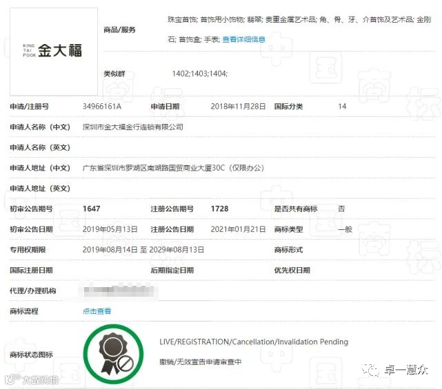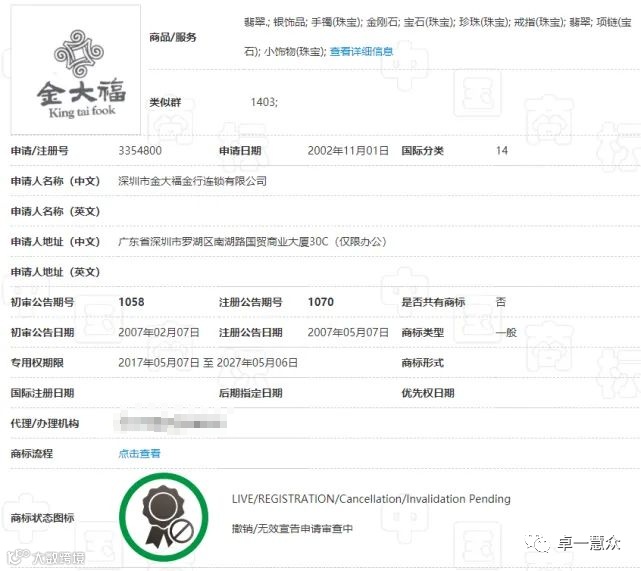 第3354800号“金大福Kingtaifook及图”(以下简称“金大福”组合商标):2001年12月4日申请,2003年2月7日获得注册,注册在第14类“宝石(珠宝)、珍珠(珠宝)、翡翠”等商品上,为金大福公司的三大核心商标之一。