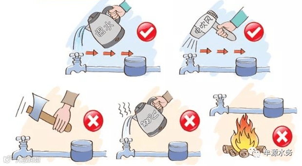 应急措施:在冻住不能用水时,不要用火烘烤或用开水烫水管、水表和水龙头等,可用电吹风烘吹,或用热毛巾包裹后慢慢用50度左右的温水浇淋,一般即可解冻,或等气温升高后,用水也可自动恢复正常。