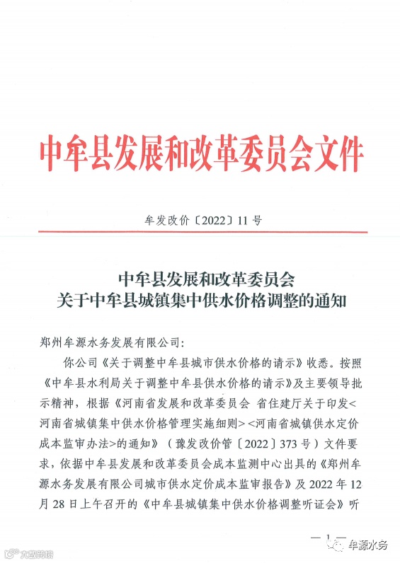 附件:中牟县发展和改革委员会关于中牟县城镇集中供水价格调整的通知