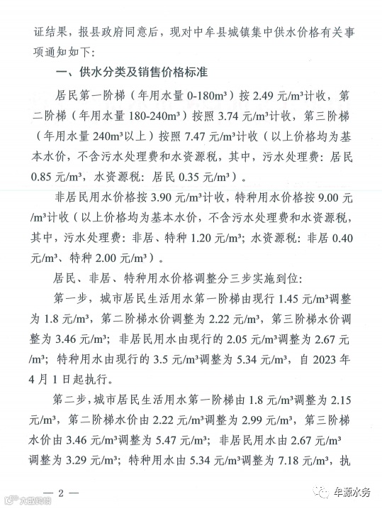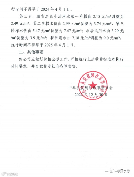 按照《中牟县发展和改革委员会关于中牟县城镇集中供水价格调整的通知》(牟发改价【2022】11号)要求,我县自来水价格将于2024年4月1日起进行第二次调整。现将有关事项公告如下: