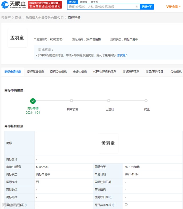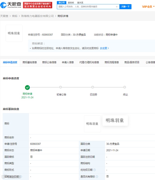 天眼查App显示,近日,珠海格力电器股份有限公司申请注册多个“明珠羽童”“孟羽童”“羽童”商标,国际分类含广告销售、科学仪器、方便食品等,当前商标状态均为申请中。