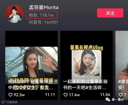 “第二个董明珠”引发的舆论热度让孟羽童抖音粉丝7天暴涨90万,其发布的《董事长秘书VLOG》和《我就是那个被董明珠选中的22岁女生》点赞量分别为17.3万和92.2万。