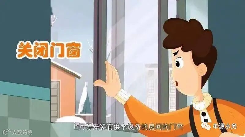 检查居民单元的防盗门、各楼层窗户以及单元内水表箱是否关严,以免造成关闭不严导致安装在楼道内的水表、水管被冻;安装了水表、水管等供水设施的房间(阳台、厨房、卫生间)要注意关闭门窗,以保证室内温度在零度以上。
