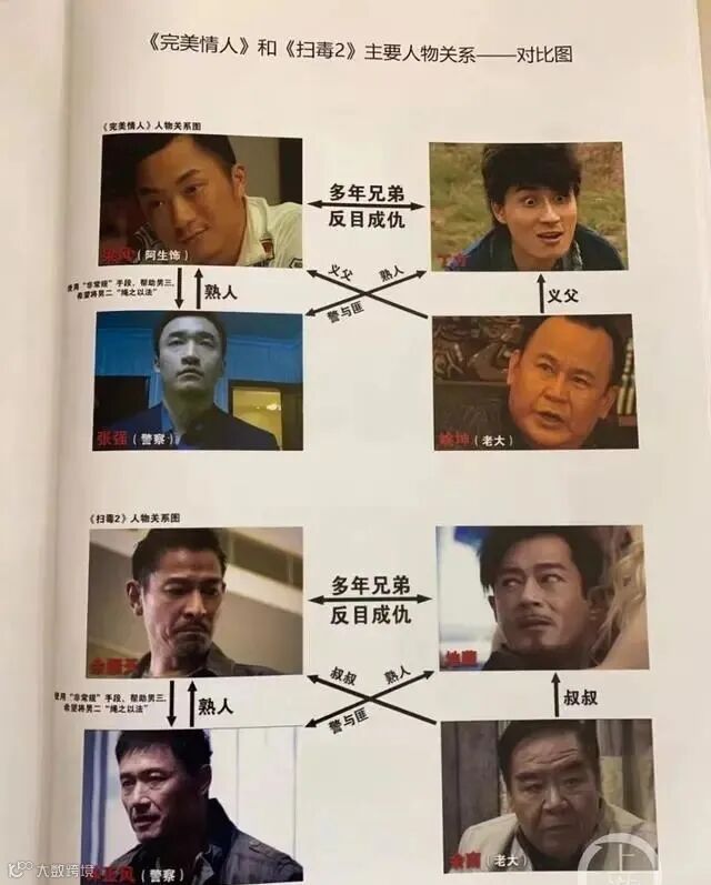 (《完美情人》与《扫毒2》主要人物关系对比图,图片来源网络)