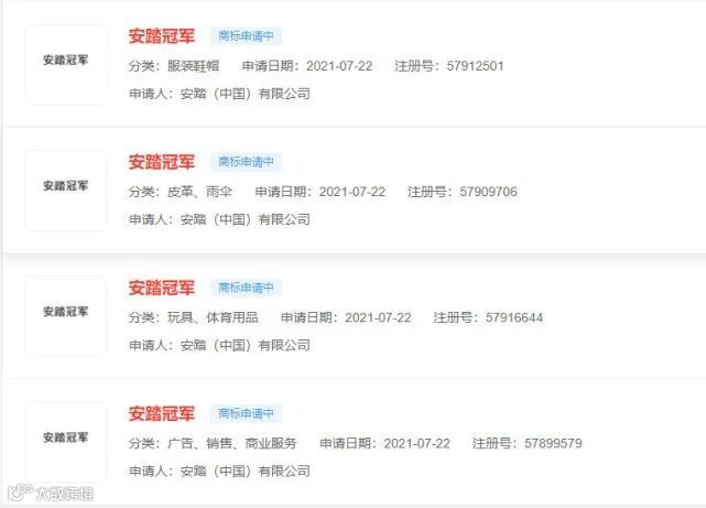 近日,据企查查显示,安踏(中国)有限公司已经着手申请注册了多个“安踏冠军”商标,国际分类涉及健身器材、服装鞋帽、广告销售等,当前商标状态为申请中。