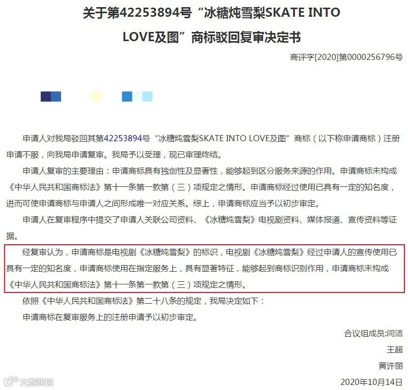 完美文化对驳回不服,于复审程序中提交了申请人关联公司的相关资料、《冰糖炖雪梨》电视剧资料、媒体报道、宣传资料等充足的证据材料。