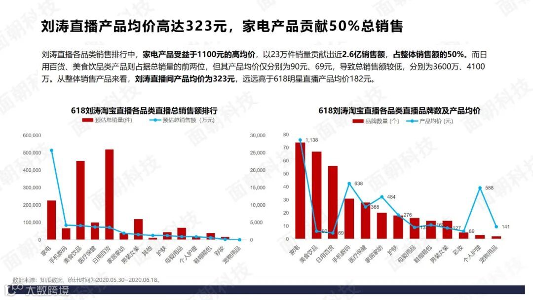 刘涛直播各品类销售排行中,家电产品受益于1100元的高均价,以23万件销量贡献出近2.6亿销售额,占整体销售额的50%。而日用百货、美食饮品类产品则占据总销量的前两位,但其产品均价仅分别为90元、69元,导致总销售额较低,分别为3600万、4100万。从整体销售产品来看,刘涛直播间产品均价为323元,远远高于618明星直播产品均价182元。