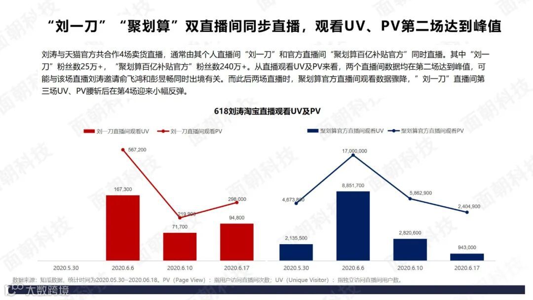 刘涛与天猫官方共合作4场卖货直播,通常由其个人直播间“刘一刀”和官方直播间“聚划算百亿补贴官方”同时直播。其中“刘一刀”粉丝数25万+,“聚划算百亿补贴官方”粉丝数240万+。从直播观看UV及PV来看,两个直播间数据均在第二场达到峰值,可能与该场直播刘涛邀请俞飞鸿和彭昱畅同时出镜有关。而此后两场直播时,聚划算官方直播间观看数据骤降,”刘一刀”直播间第三场UV、PV腰斩后在第4场迎来小幅反弹。