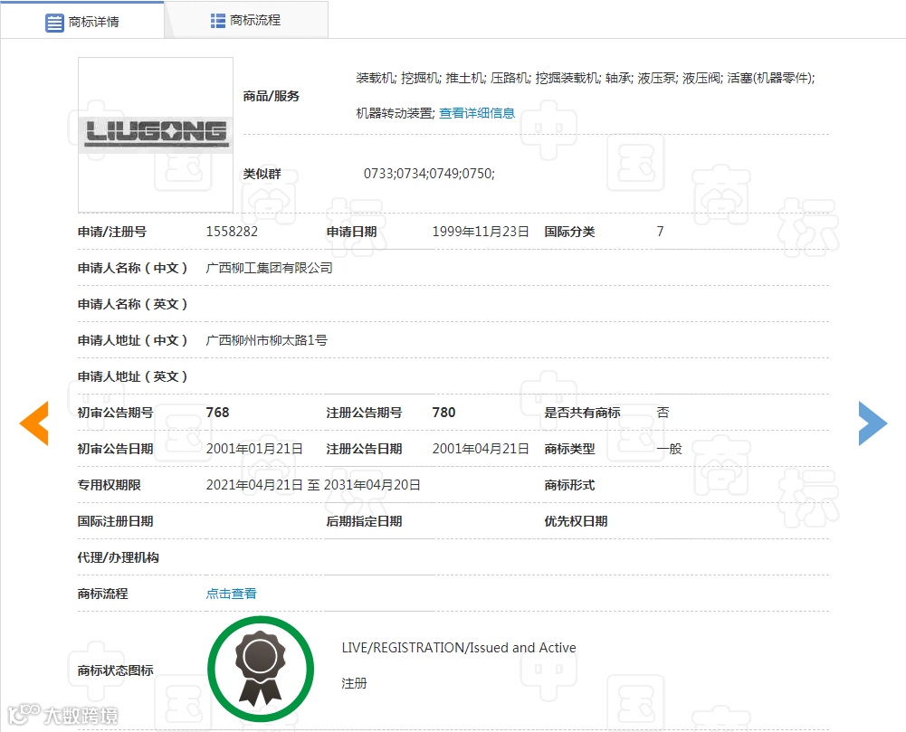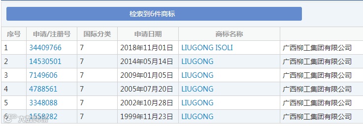 此后,柳工集团又分别在2005年和2014年申请了“LIUGONG”的同名商标,国际分类为7—机械设备类。