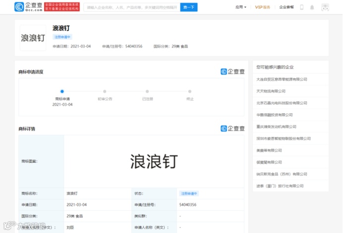天眼查App显示,“浪浪钉”商标被申请注册,国际分类为29类食品,申请人为刘臣,申请日期为2021年3月4日,当前商标状态为“商标申请中”。