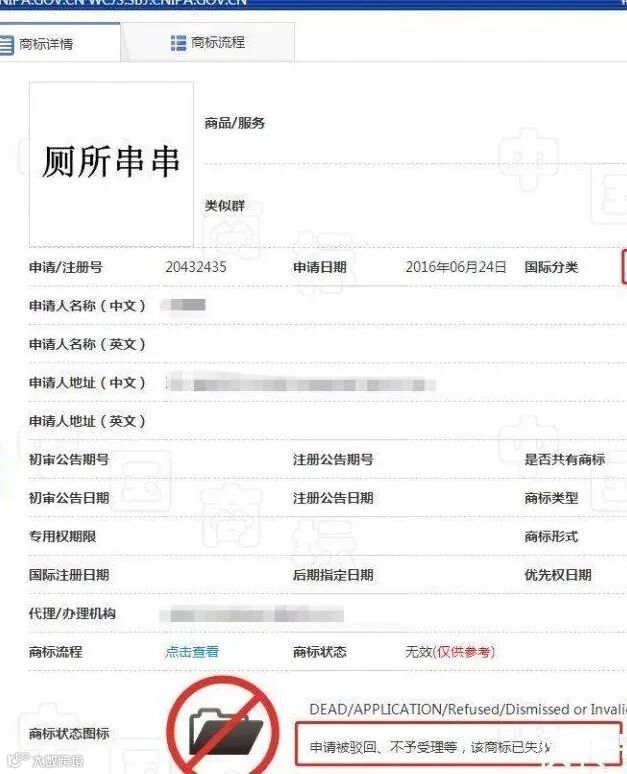 随后经知识产权局裁定:“‘厕所串串’指定使用服务为第43类‘餐馆、饭店’等,‘厕所’泛指进行生理排泄和放置、处理排泄物的地方,‘厕所串串’一词使用在该服务上易产生社会不良影响而不予注册”。