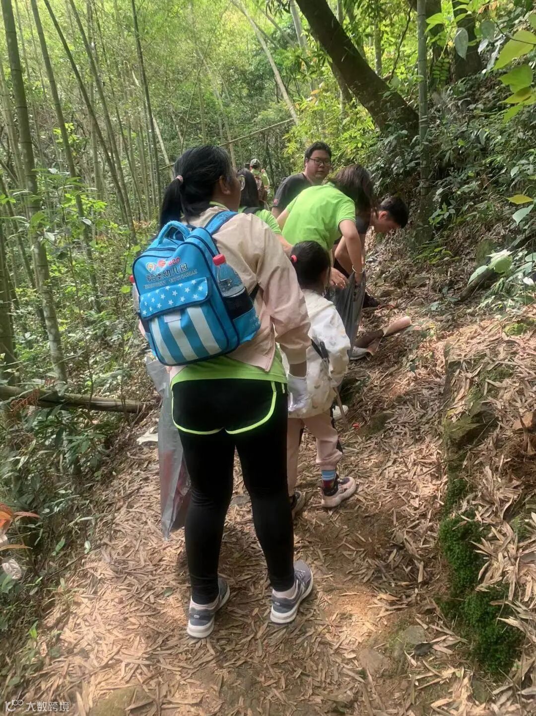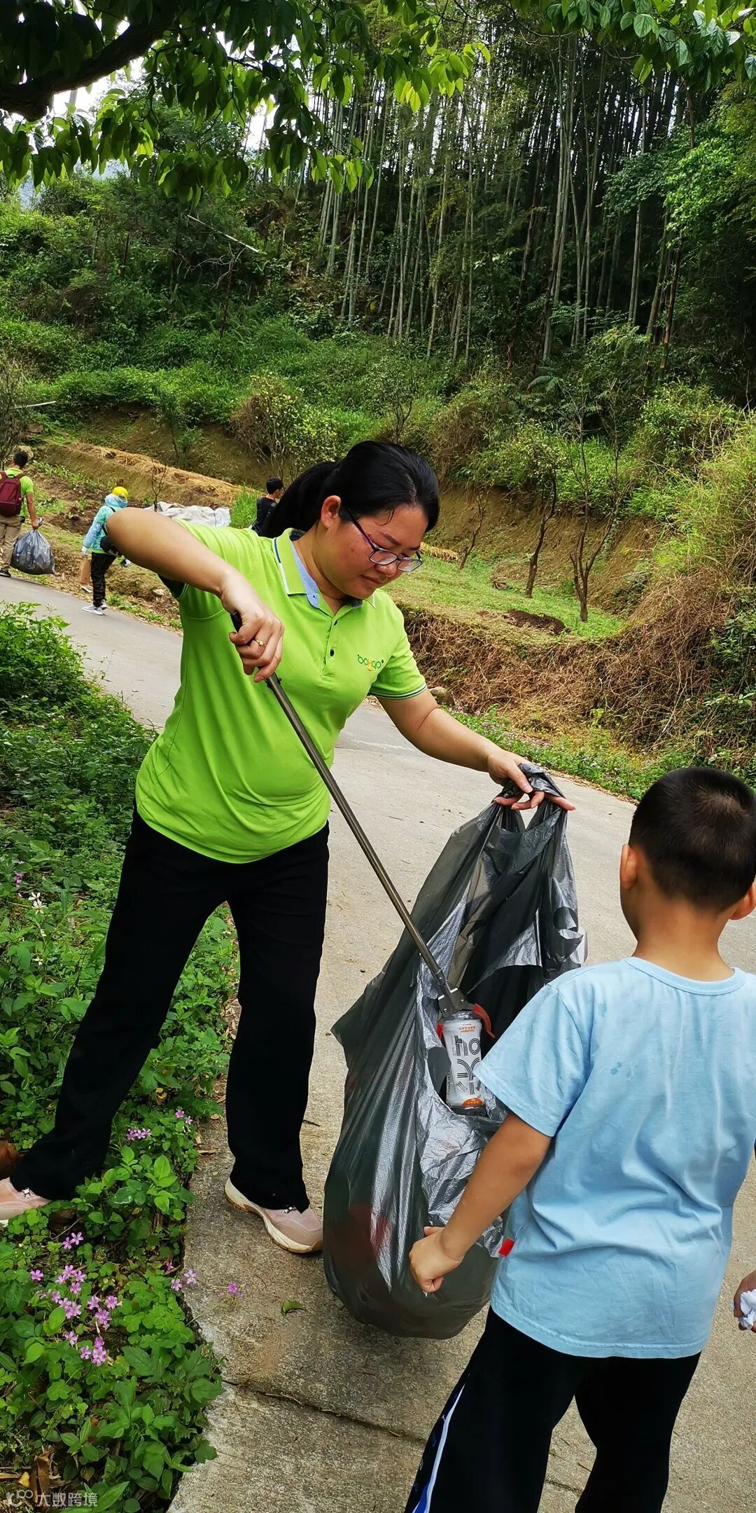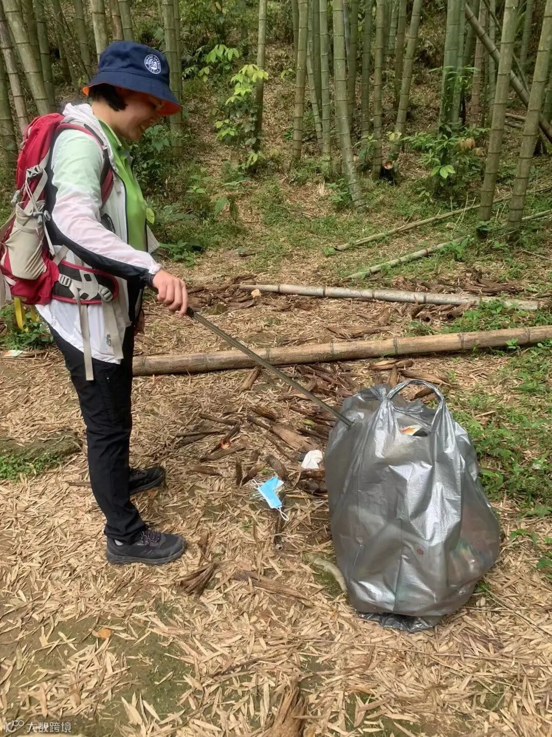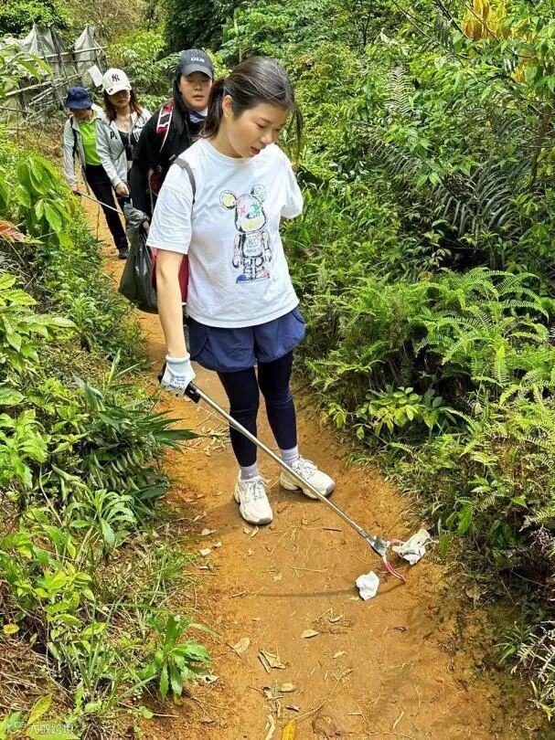 早上10点到了目的地,全员下了车,拿出“传承”下来的家伙:环保手套、垃圾钳、大大小小的垃圾袋,换上公司夏天短袖绿色工装,化身环卫人士,犹如竹林间驱虫的小鸟儿般为大山清除垃圾。