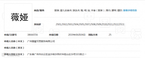 诉争商标为原告广州薇蜜可思服饰有限公司在2019年6月申请注册的38666556号“薇娅”商标。指定使用品类包括服装、婴儿全套衣等。
