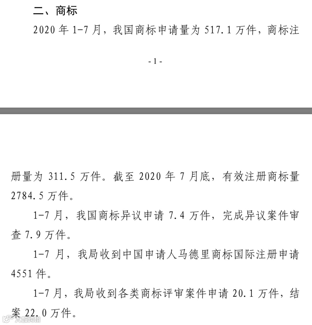 1-7月,我国商标申请量为517.1万件,增长率20%,商标注册量为311.5万件,减少24%。