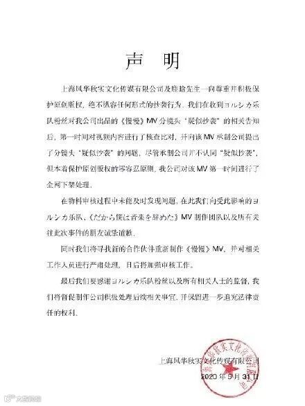 鹿晗工作室对此迅速做出反应,5月31日,鹿晗工作室发文回应鹿晗新歌MV抄袭问题,表示鹿晗先生以及团队对待版权问题一向坚持"零容忍原则",在此向乐队以及所有关注此事件的朋友诚挚道歉,日后会加强对物料制作的审核。