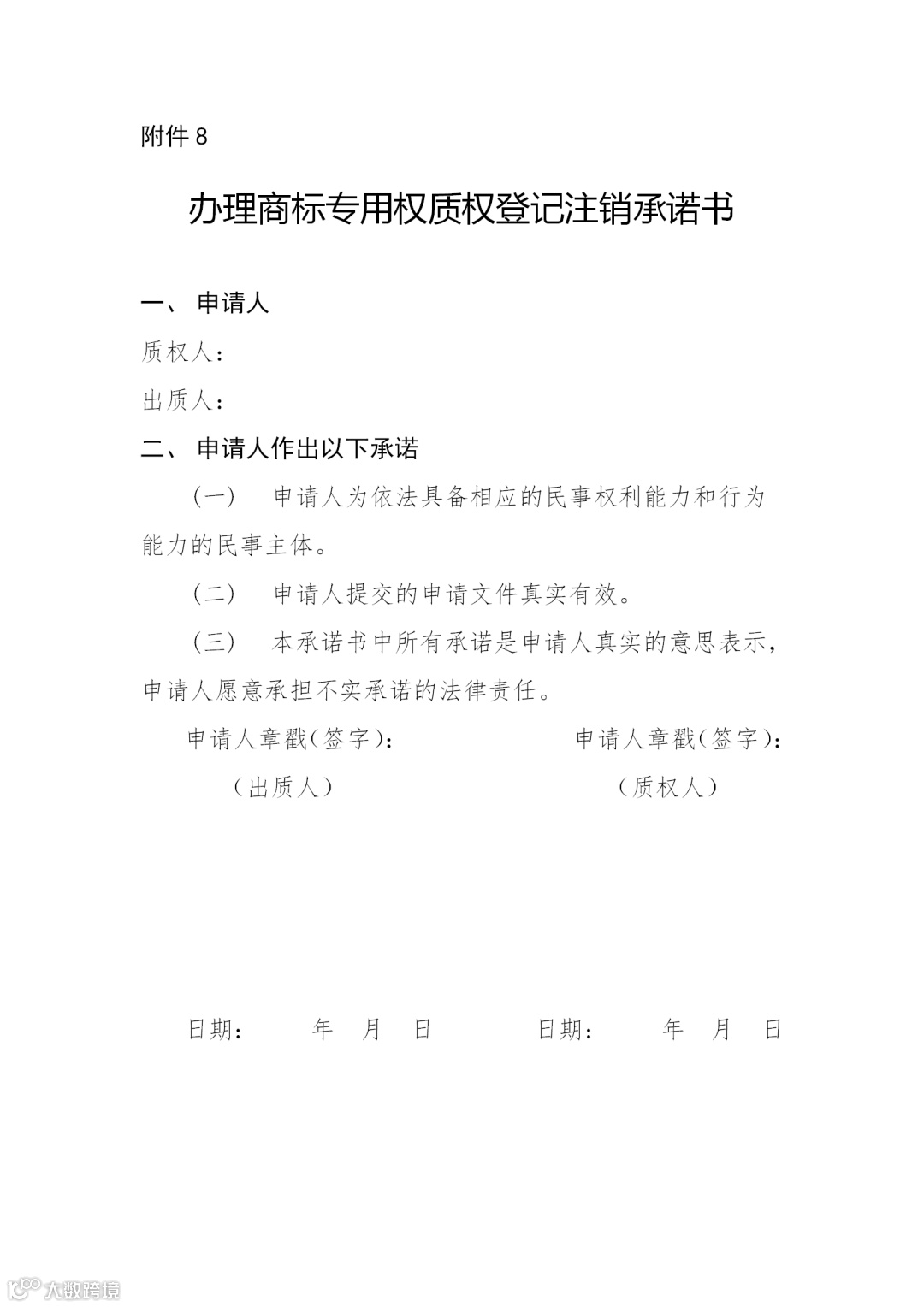 附件:8.办理商标专用权质权登记注销承诺书