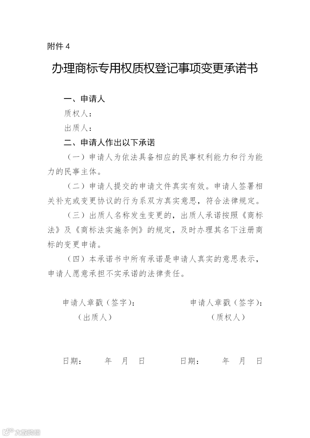 附件:4.办理商标专用权质权登记事项变更承诺书附件