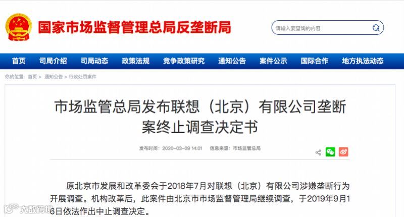 今年3月3日,联想反垄断案落下帷幕——北京市场监管局作出终止调查决定。3月9日,国家市场监管总局反垄断官网公告了上述消息。