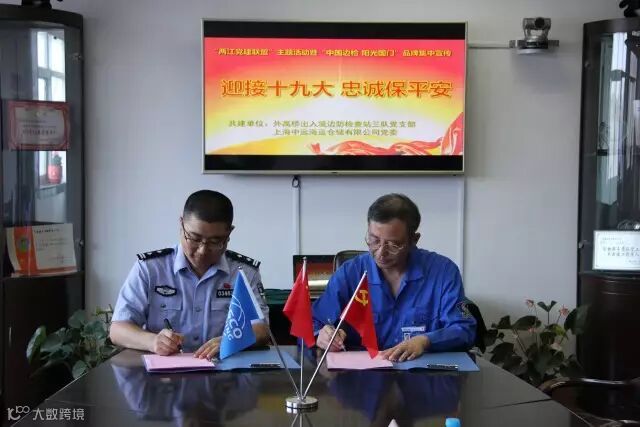 为深入开展“两学一做”学习教育常态化制度化,探索新形势下党建活动新模式,进一步推动警企共建活动不断向纵深发展。8月16日下午,上海中远海运仓储有限公司党委与外高桥出入境边防检查站三队党支部举行了党建联建、文明共建签约仪式。外高桥边检三队队长石磊和公司党政领导班子及双方相关部门负责人出席仪式。