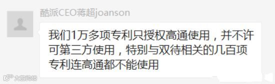 此后他还透露:“我们1万多项专利只授权高通使用,并不许可第三方使用,特别与双待相关的几百项专利连高通都不能使用。”