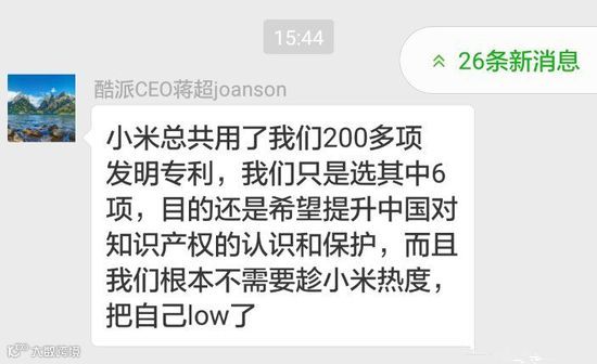 率先发飙的酷派的CEO蒋超,他在某群里宣称:“小米总共用了我们200多项发明专利,我们只是选其中6项,目的还是希望提升中国对知识产权的认识和保护,而且我们根本不需要趁小米热度,把自己low了。”