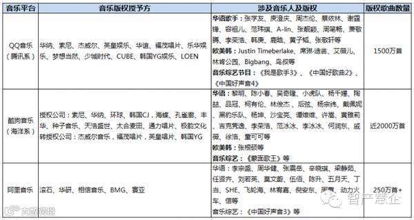 强强联合的QQ、酷狗,关起门来单干的阿里经过多次版权更迭,腾讯、海洋、阿里国内三大主流互联网音乐平台今年的版权格局已经基本确定。其中,腾讯系的QQ音乐独家代理了华纳音乐、索尼音乐、杰威尔音乐、福茂音乐等200多家版权方的内容,拥有1500万首歌曲版权;以酷狗音乐代表的海洋系和太合麦田、海蝶、丰华、种子音乐等海内外600家版权方达成合作,现有歌曲版权达到2000万首;阿里则拥有滚石、华研、寰亚、BMG等公司的版权,版权歌曲数量目前无官方统计,但应该超过250万首。