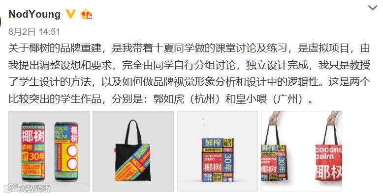 经了解才发现,这其实是杭州的设计师NodYoung带领学生们做了一个“椰树品牌重建”的虚拟项目,其中有两位学生的作业很出彩。