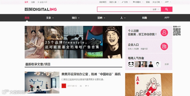 推荐理由:前身是互动中国,是广告圈做UGC最成功的一个网站,全网用户参与投稿,编辑部审核筛选出优秀内容,整合数字业界信息。企业入驻较多,各个广告领域的公司都能在数英发现它的蛛丝马迹。新项目实时更新,更是广告人的风向标,观数英就知广告行业什么流行不流行。
