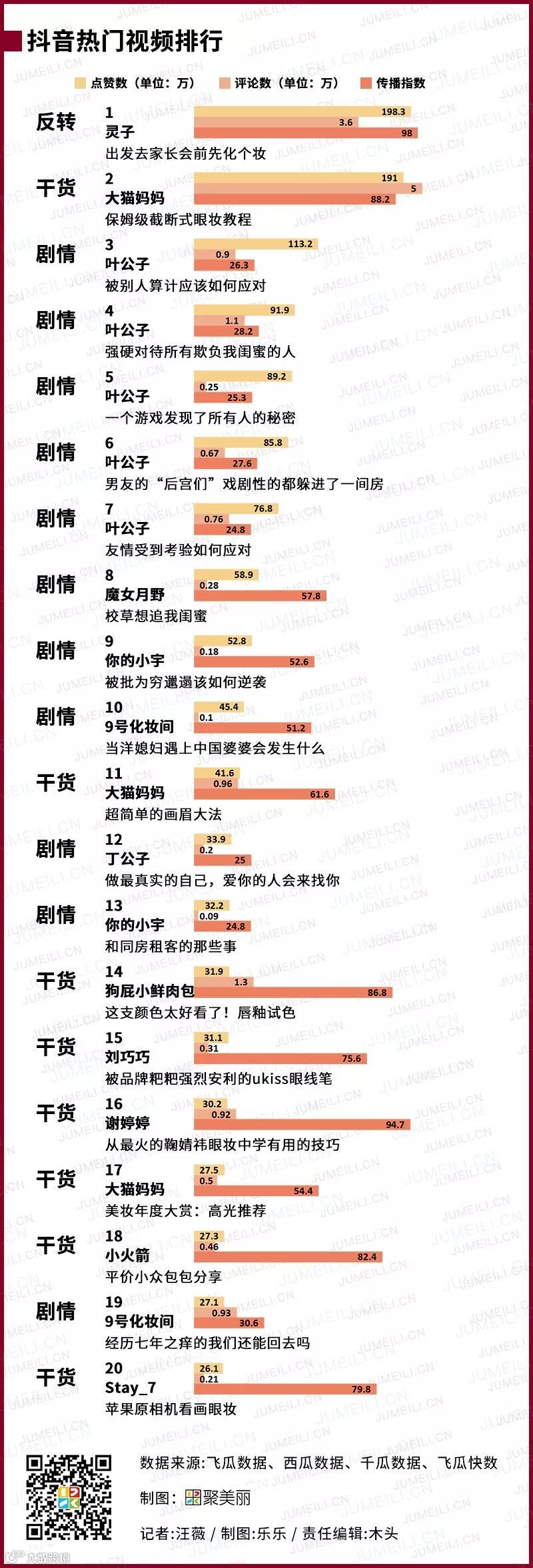 取而代之的是“9号化妆间”、“大猫妈妈”等播主的作品,但本次“灵子”的化妆视频以近200万点赞量排在了第一。