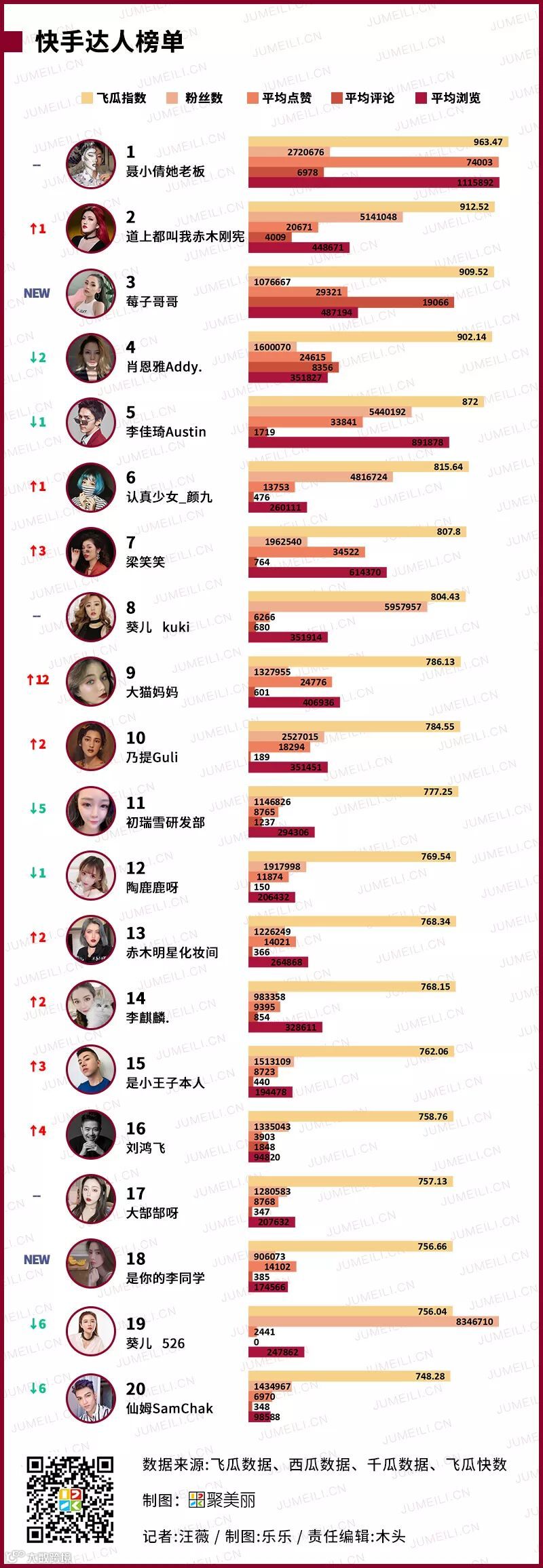 为此,聚美丽最新《数聚》栏目联合面朝科技,结合面朝旗下四大数聚平台飞瓜数据、西瓜数据、千瓜数据、飞瓜快数,分别对抖音、公众号、小红书、快手四大知名社交平台的品牌、红人等监测数据进行跟踪分析,定期推出社媒平台数据监测报告。
