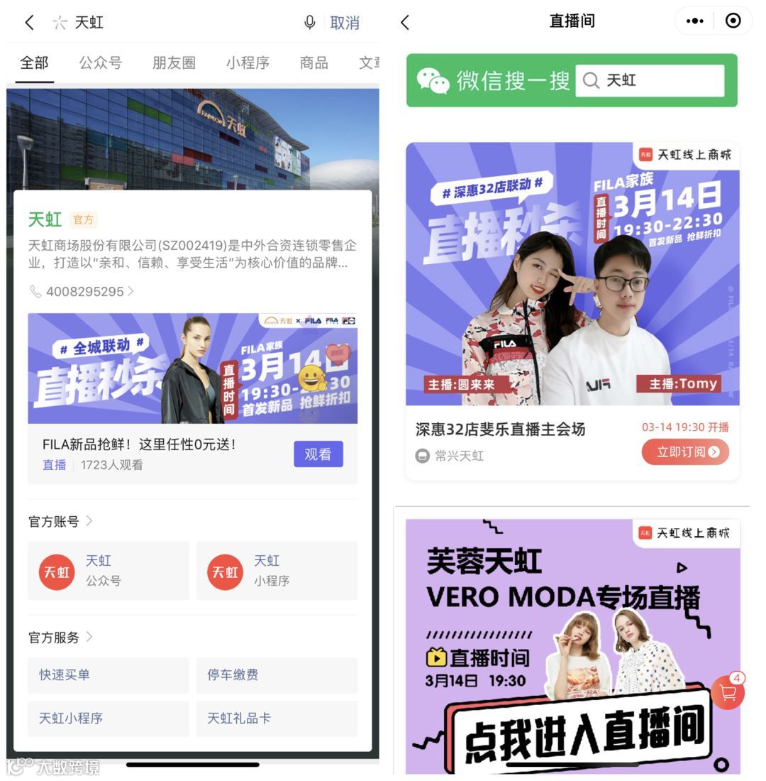 前几天天虹尝试了一种新玩法——“搜索直达直播”。用户在微信搜索“天虹”就可以直接到达直播现场。半公域的搜一搜引流至小程序直播私域沉淀,3月14日,天虹联动斐乐品牌专场直播,搜一搜品牌官方区当天有50.15%的点击率;活动当天斐乐天虹全国线上销售超200万。