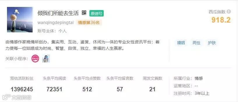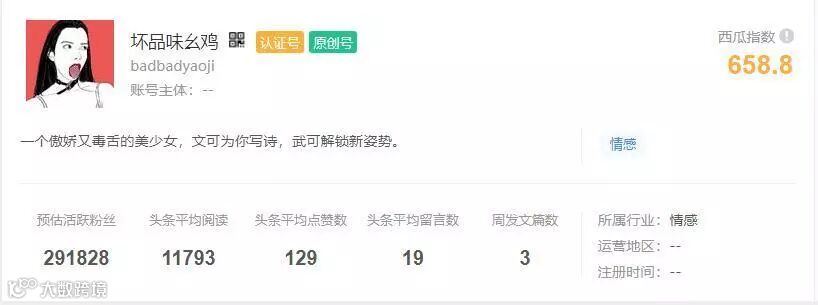 从各方面的数据上都能看到,【坏品味幺鸡】虽阅读不高,但是也是个值得关注的优质情感类公众号。