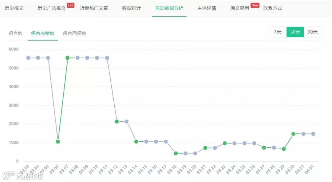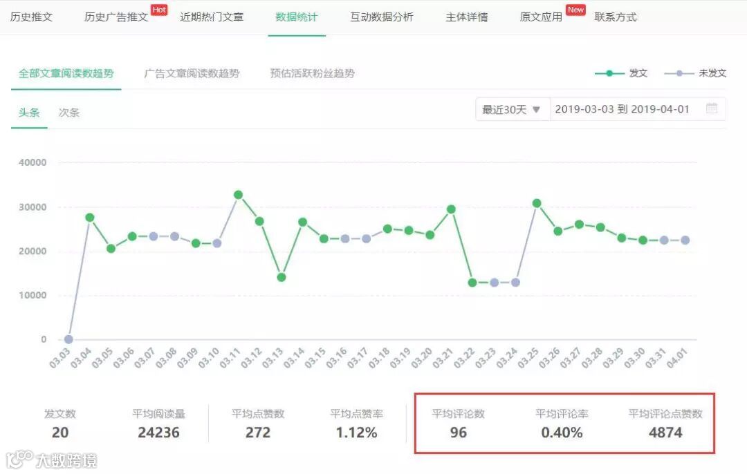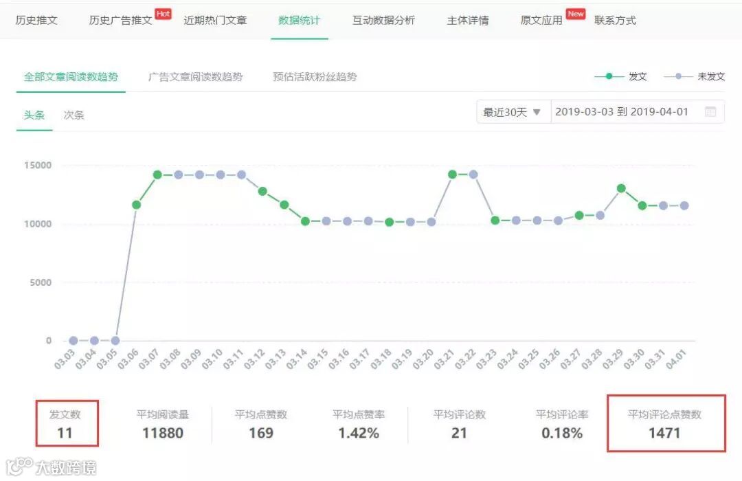 近7天发文数高达21篇,可以说是属于高产量的公众号了。在高产量的文章发文数中,除去头条7.2万左右的平均阅读外,二条三条文章不论从点赞还是评论上来看,表现也是相当不错的。