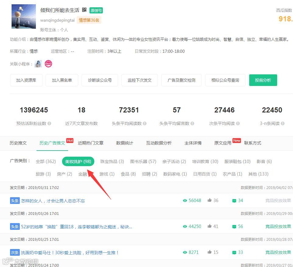 此外,文中推荐的优质号主要是从公众号的阅读真实性、内容质量和粉丝活跃度等方面进行考量,有些公众号日常的发文阅读可能很高,但是广告文章的阅读可能会有所减少,所以在此建议广告主们,投放广告与号主议价的时候也可以参考一下公众号的历史广告文章阅读量哈。