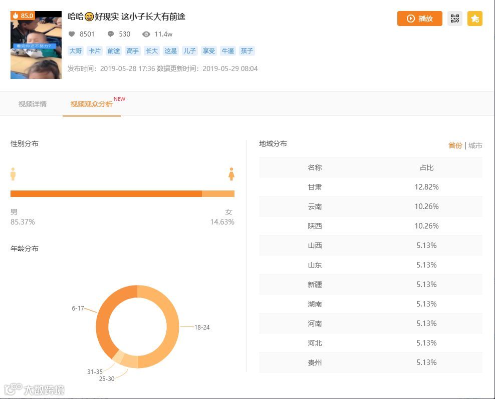 想要知道这条视频最受哪个群体欢迎,点击视频观众分析就能知晓。性别、年龄、地域信息全部展现给你。
