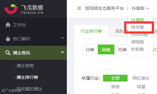 或者在飞瓜数据页面顶端选择“快手版”分类,即可前往“飞瓜数据快手版”