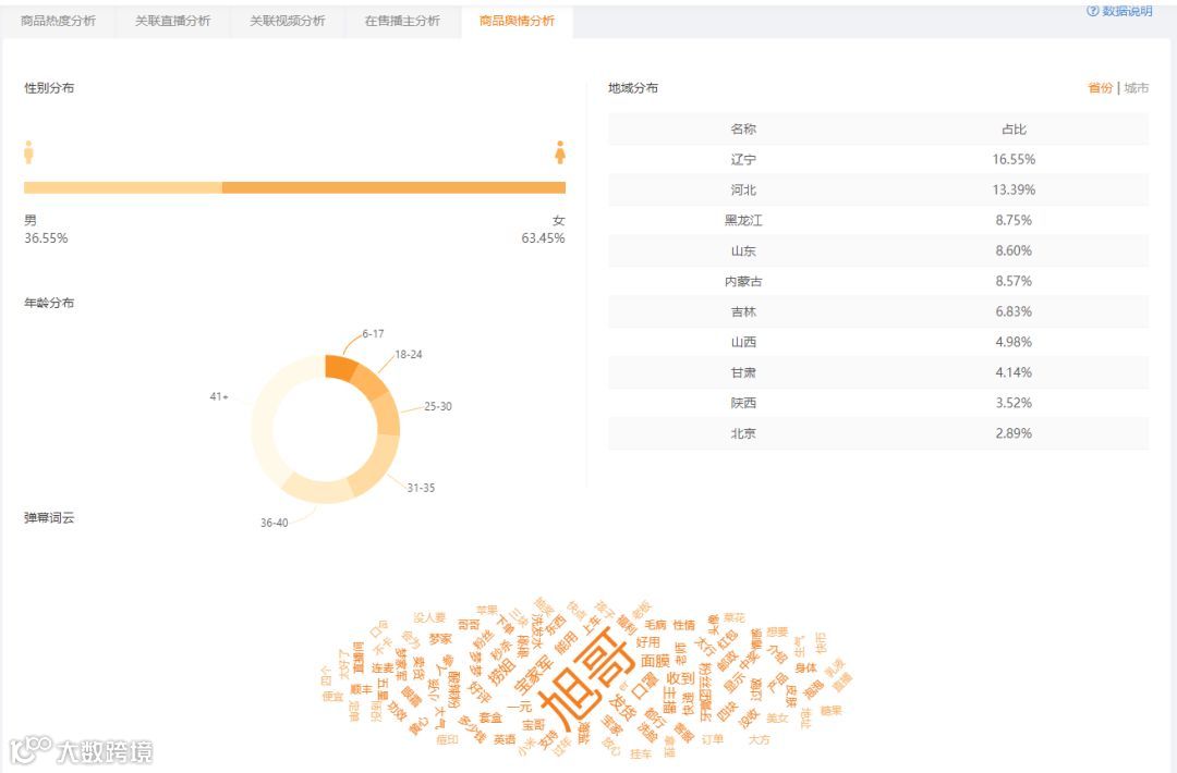 商品关联的直播间弹幕词云里显眼的“旭哥”二字更加说明了这款商品和旭哥的关联度。其他词语比如:好用,好评,支持等弹幕,也说明粉丝的粘性高。