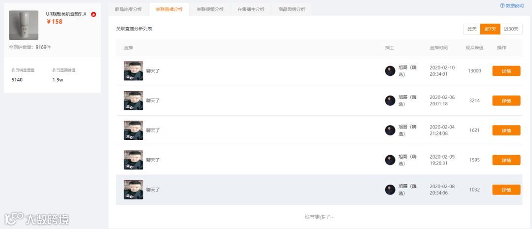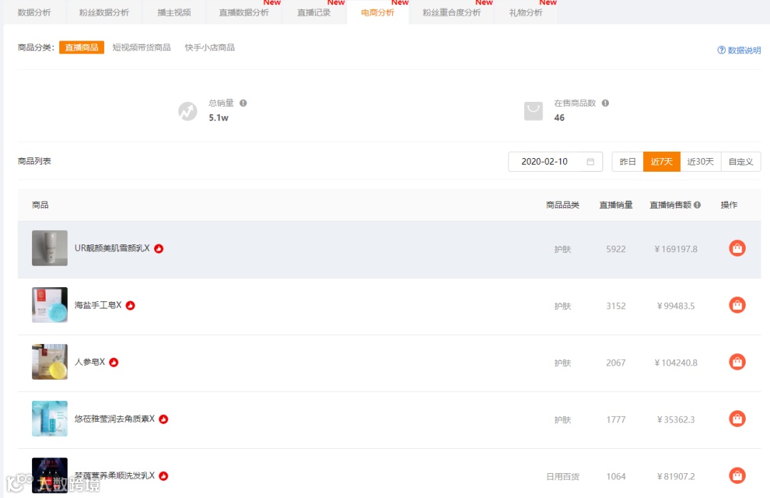 那么旭哥究竟在直播带货中卖了哪些商品呢?可以通过电商分析功能看到,近7天销量最高的是一款来自有赞平台的护肤品“雪颜乳”,销量近六千。