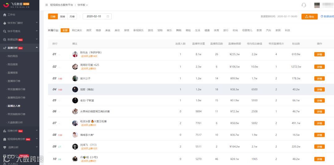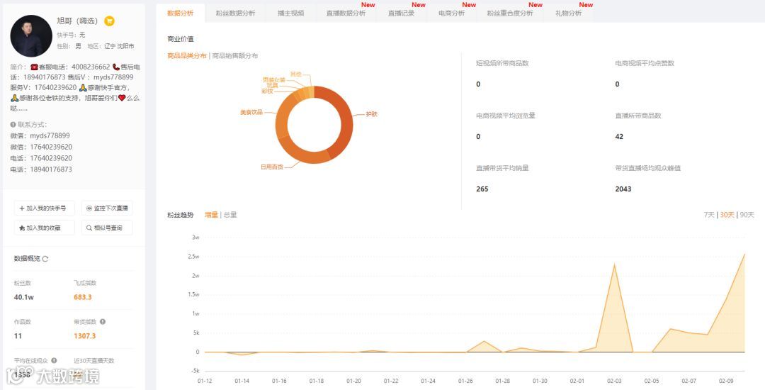 我们以2月10日直播达人排行榜中上升最快的“旭哥”分析介绍一下飞瓜快手的功能吧。