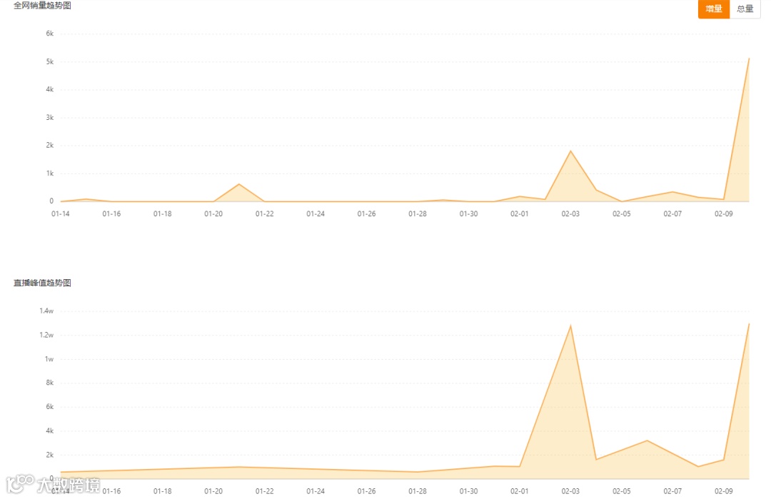 再点击这款商品的详情,可以看到更多关于这款商品的数据。对比“雪颜乳”的全网销量增量和快手平台的直播间峰值人数,可以看到两者都在2月3日和2月10日到达一个数据的波峰。