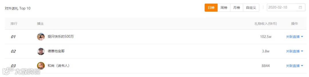 2月3日和10日分别是涨粉和销售额的波峰,让人十分好奇旭哥这两天做了什么。长期观察快手电商的习惯告诉我,要观察下旭哥挂榜打赏情况。巧的是,飞瓜快手版有查询快手达人挂榜打赏的功能。