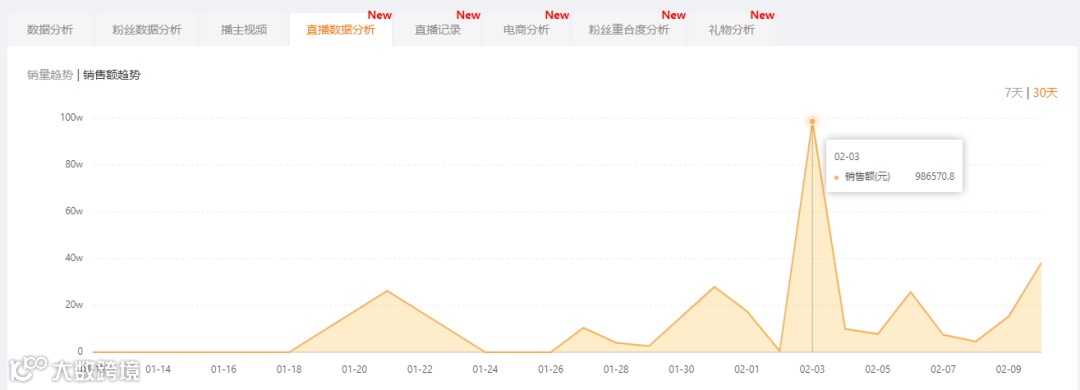 最重要的带货销售额趋势图也可以通过飞瓜快手版直观了解,其中2月3日达到顶峰,带货销售额高达98万。