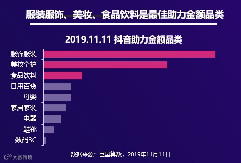 2019年抖音"双十一"各品类助力金额排名