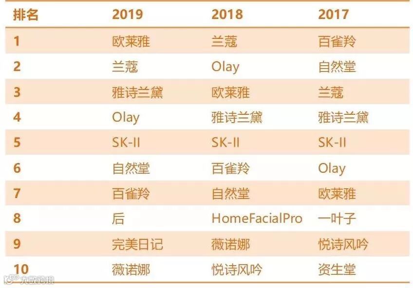 ,兰蔻位居第二,雅诗兰黛上升至第三,Olay排名下降至第四,SK-II排名第五。