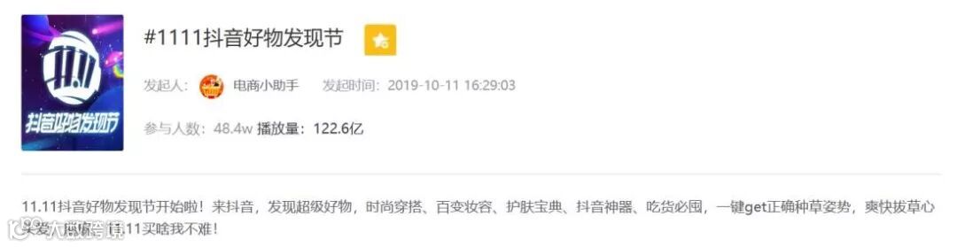 #1111抖音好物发现节 参与人数达48.4w,共获得122.6亿次播放量